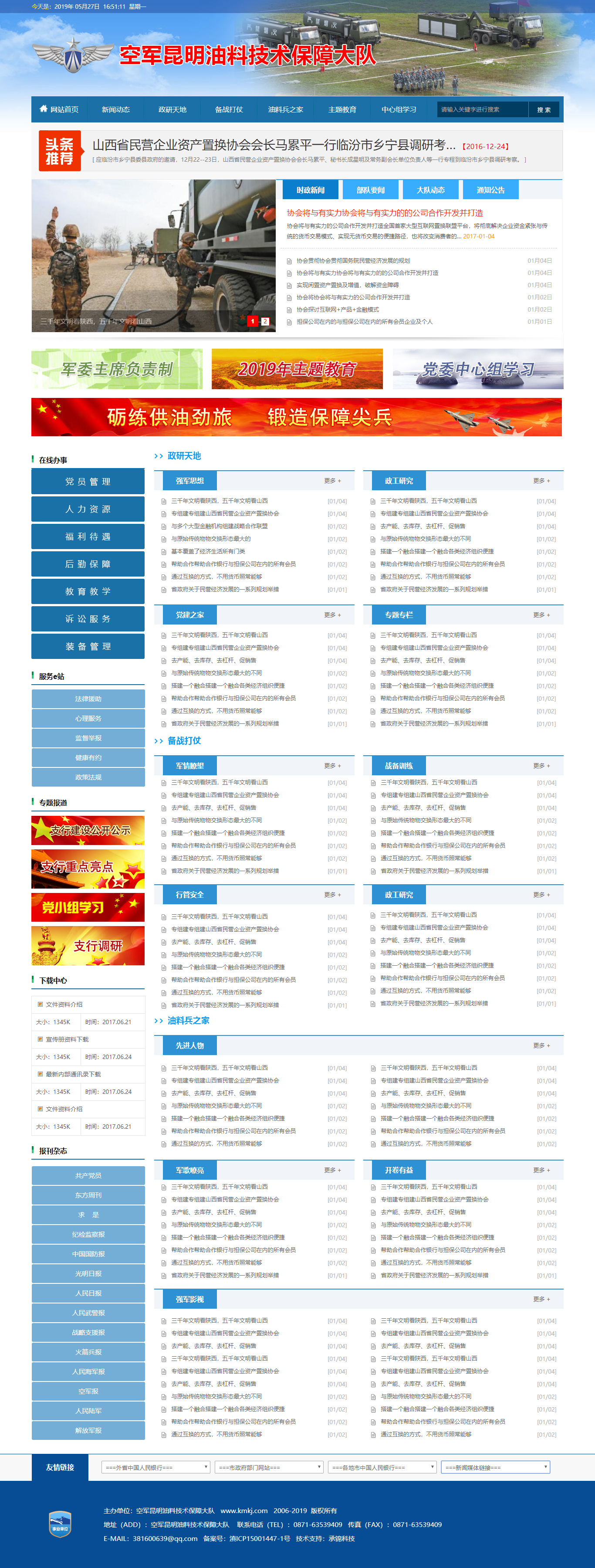 空軍昆明油料技術(shù)保障大隊(duì)官方網(wǎng)站由云南承錦科技有限公司提供技術(shù)支持,網(wǎng)站包含欄目:網(wǎng)站首頁/新聞動(dòng)態(tài)/政研天地/備戰(zhàn)打仗/油料兵之家/主題教育/中心組學(xué)習(xí)等。