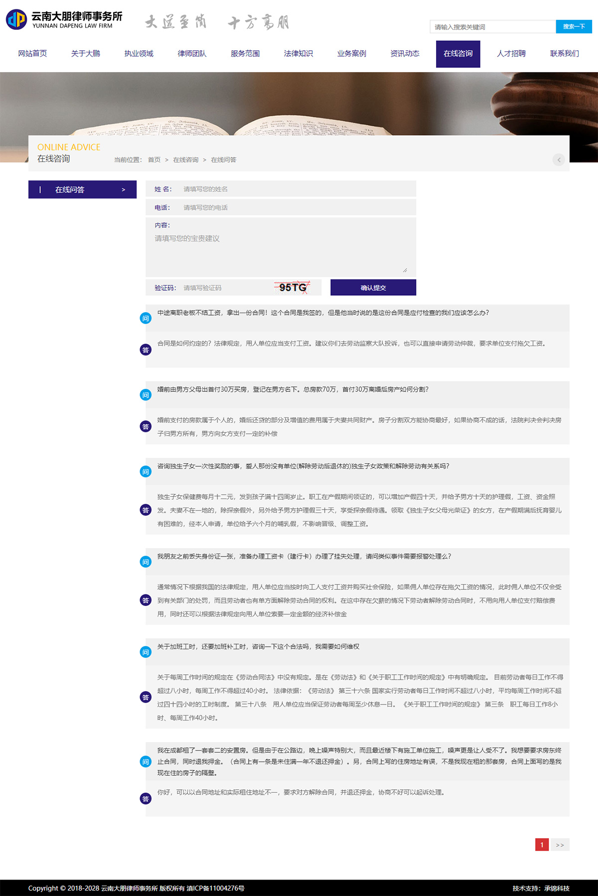 網(wǎng)站支持電腦端和移動(dòng)端的用戶訪問,包含關(guān)于大鵬、執(zhí)業(yè)領(lǐng)域、律師團(tuán)隊(duì)、服務(wù)范圍、法律知識(shí)、業(yè)務(wù)案例、資訊動(dòng)態(tài)、在線咨詢、人才招聘、聯(lián)系我們欄目,其中在線咨詢用戶可以在網(wǎng)站咨詢遇到的法律問題!